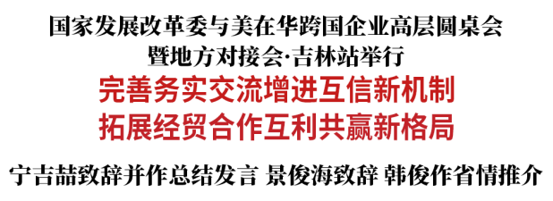 景俊海代表省委、省政府,向与会嘉宾表示欢迎,向国家发展改革委及各跨国企业对吉林的关心支持表示感谢。他说,国家发展改革委邀请美国在华商会和全球重量级企业,在东北首次举办高层圆桌会,是深入贯彻习近平总书记视察吉林重要讲话重要指示精神的实际行动,对进一步深化中美合作、促进务实交流具有重要意义。当前,吉林正处于历史上升期、产业增值期、发展提速期、振兴黄金期。我们正以习近平新时代中国特色社会主义思想为指引,加快推动高质量发展,全面扩大对外开放,以开放促合作、以合作促发展、以发展谋共赢。希望大家把握吉林机遇,参与吉林开放,深耕吉林市场,持续完善务实交流、增进互信新机制,着力拓展经贸合作、互利共赢新格局。一是进一步深化产业领域合作,深度对接、完善配套、延伸链条,共同推动产业转型升级。二是进一步深化能源领域合作,积极参与吉林“陆上风光三峡”等重大项目建设,共同做大做强新能源产业,更好促进碳达峰碳中和。三是进一步深化科技领域合作,共同开展核心关键技术攻关,加快科技成果转化应用,携手提升科技创新能力。我们一定全面落实《外商投资法》,努力打造国际化、法治化、便利化的投资营商环境,让大家投资放心、创业安心、发展顺心。