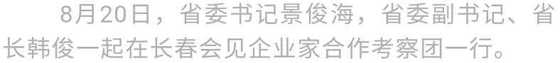 8月20日,省委书记景俊海,省委副书记、省长韩俊一起在长春会见粤港澳大湾区数字经济研究院理事长、小冰公司董事长,美国国家工程院外籍院士、英国皇家工程院外籍院士沈向洋等组成的企业家合作考察团一行。