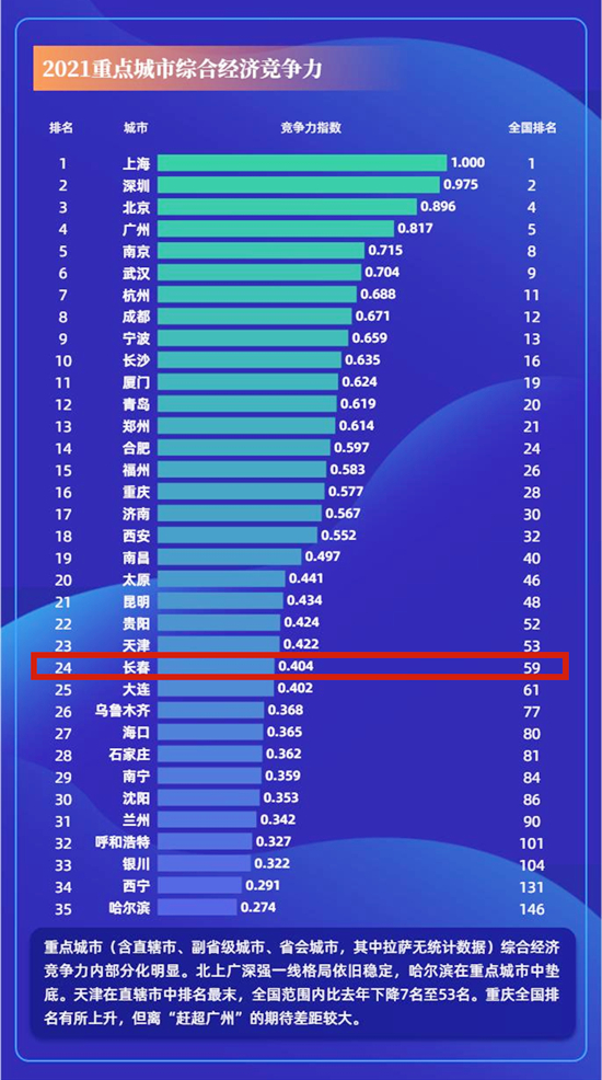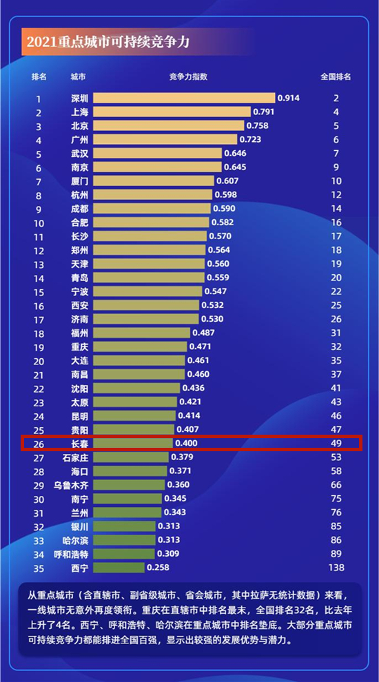 值得注意的是,在2021年中国城市综合经济竞争力排行榜中,吉林省8个城市入围,它们是:长春(59位)、吉林(224位)、辽源(227位)、通化(238位)、松原(244位)、白山(245位)、四平(251位)、白城(278位),按全国35个重点城市排名长春位列第24位;在35个重点城市可持续竞争力榜单上长春位列第26位,在东北地区入围城市中位列首位。
