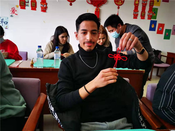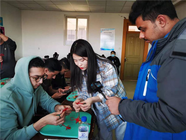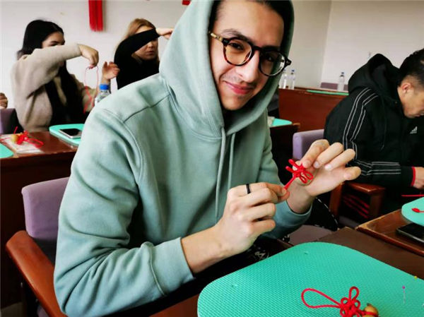 来自孟加拉国的苏磊对中国的人文风土特别感兴趣,在编织中国结的过程中也在不断地录制视频。这位YouTuber来到中国三年,在“China Soyeb”账户分享在吉生活感受,书法、鱼皮画、葫芦画、中国结样样都学得颇为认真。看到墙上挂着的大号中国结时,他不住地观察抚摸,并急于和记者分享热烈心情,“中国结特别漂亮,我十分喜欢!”