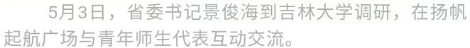 在五四青年节即将到来之际,省委书记景俊海今天(5月3日)到吉林大学调研,传达习近平总书记给中国航天科技集团空间站建造青年团队回信精神,与大家共同学习习近平总书记在中国人民大学考察时的重要讲话精神,希望广大青年时刻牢记习近平总书记谆谆教诲,发扬五四精神,立志民族复兴,勇于创新突破,不负韶华,不负时代,不负人民,争做新时代的奋斗者、追梦人、实干家,在吉林振兴发展舞台上埋头苦干、成就事业。