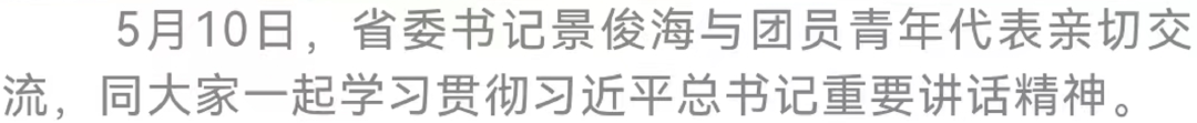 今天(5月10日)上午,庆祝中国共产主义青年团成立100周年大会在北京隆重举行。中共中央总书记、国家主席、中央军委主席习近平出席并发表重要讲话。省委书记景俊海等省领导与团员青年代表一起收看电视实况直播,认真聆听习近平总书记重要讲话。