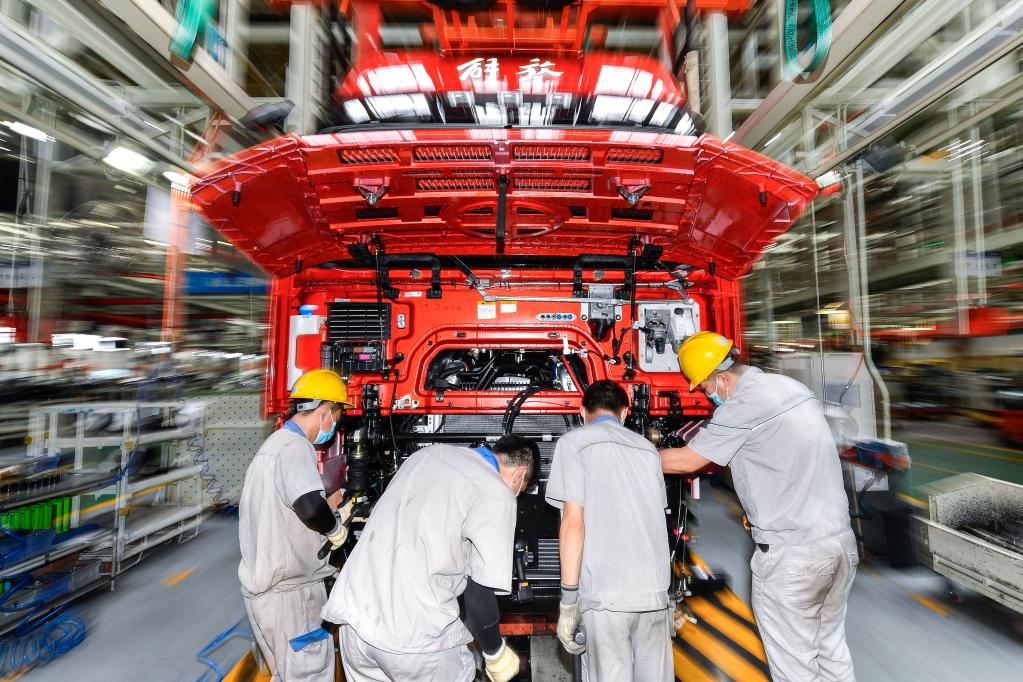 工人在位于吉林长春的一汽解放总装车间内装配车辆。 新华社记者 许畅 摄
