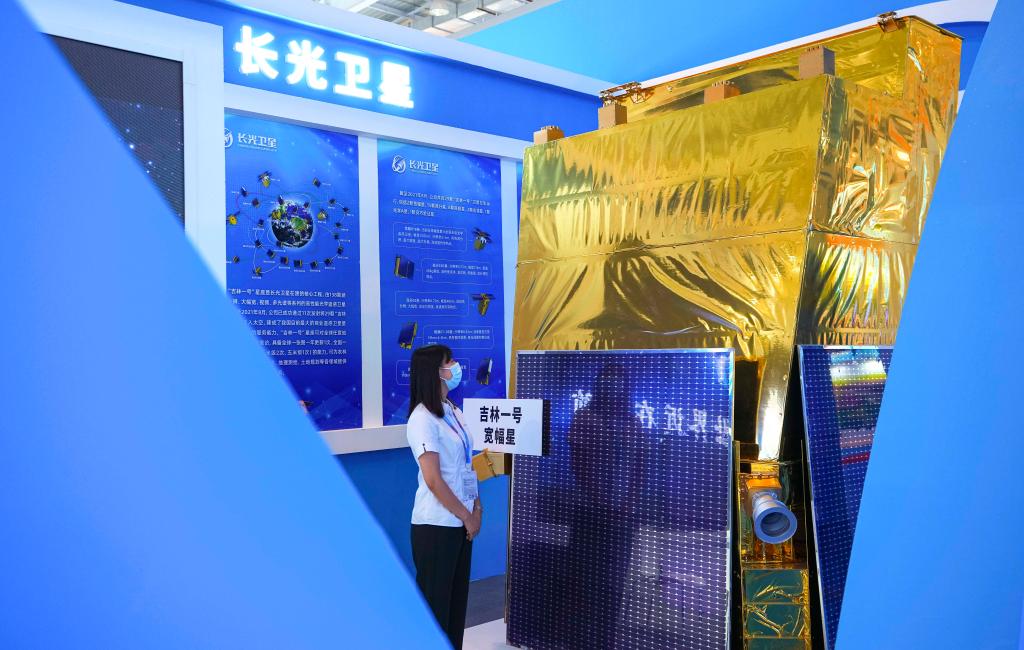 参观者在东北亚博览会现场参观展出的“吉林一号”光学遥感卫星等比模型。 新华社记者 许畅 摄