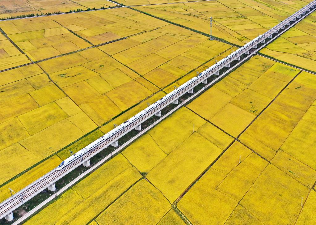 高铁列车从吉林省公主岭市沃野间驶过。 新华社记者 张楠 摄