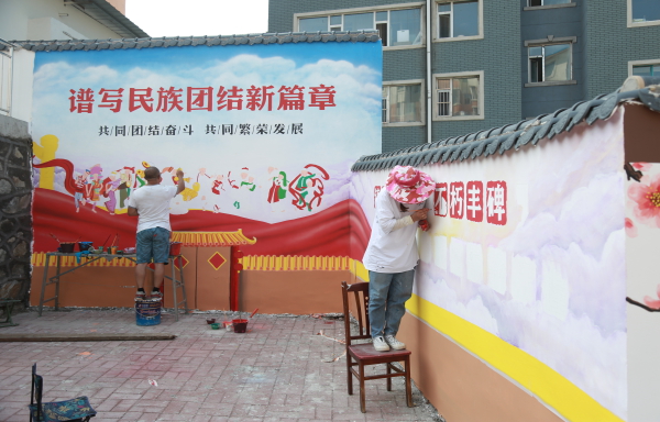 7月4日,延吉市北山街道丹英社区民族团结主题彩绘墙正在进行彩绘,州庆吉祥物龙龙和富有各民族特色的卡通人物跃然墙上,栩栩如生,十分吸睛。