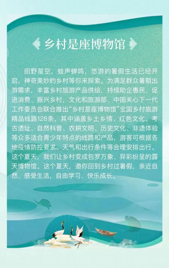 近日,文化和旅游部、中国关心下一代工作委员会联合推出 “乡村是座博物馆” 全国乡村旅游精品线路128条。