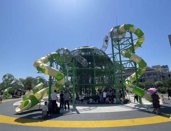 绿荫赛场是男孩子们最为喜爱的运动设施之一,他们以矫健的身手勇敢地通过重重关卡,还不时地与家人招手示意。场外也有不少孩子在工作人员的引导下有序排着队伍,等待下一场能进去体验一把。绿荫赛场附近的儿童娱乐沙坑内,不少儿童在父母的陪伴下,拿着手中小铲子愉快地挖沙子、堆沙堡,十分热闹。