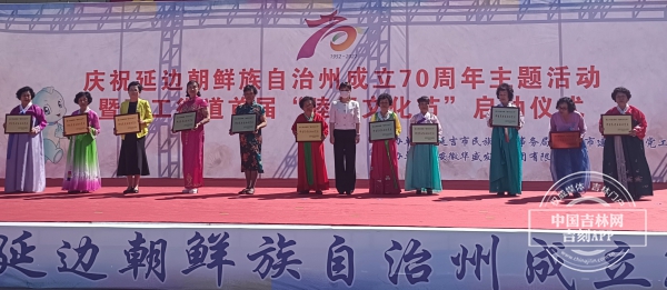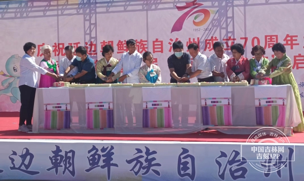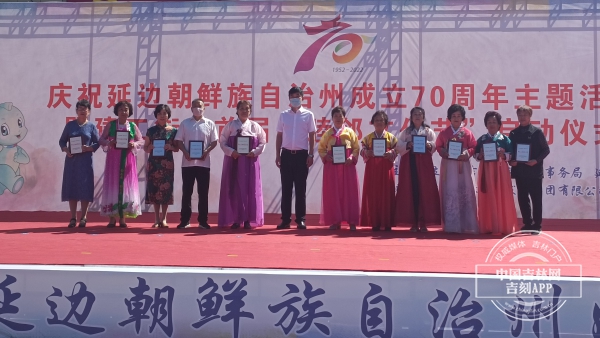 现场为受表彰的示范家庭和示范点颁发奖牌,与会领导与70岁老人们一同切生日蛋糕共庆延边州成立70周年。