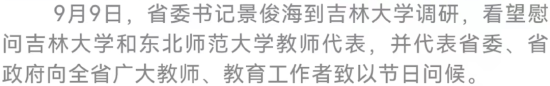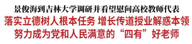 在第38个教师节来临之际,省委书记景俊海今天(9月9日)到吉林大学调研,看望慰问吉林大学和东北师范大学教师代表,与大家一起学习习近平总书记给北京师范大学“优师计划”师范生的回信精神,勉励大家始终牢记习近平总书记殷殷嘱托,落实立德树人根本任务,增长传道授业解惑本领,努力成为党和人民满意的“四有”好老师。
