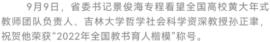 景俊海专程看望全国高校黄大年式教师团队负责人、吉林大学哲学社会科学资深教授孙正聿,祝贺他荣获“2022年全国教书育人楷模”称号,希望全省广大教师向孙正聿教授学习,当好学生成长的引路人,并要求有关部门加大宣传力度,讲好优秀教师故事,努力在全社会营造尊师重教的浓厚氛围。