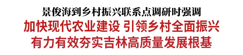 调研中,景俊海强调,通榆县要聚焦全面实施“一主六双”高质量发展战略,科学谋划、精准施策,大力培育特色经济和支柱产业,持续厚植发展新优势、塑造发展新动能。要着力加快现代农业建设,立足“粮头食尾”“农头工尾”“畜头肉尾”,科学实施全产业链开发,助力吉林打造农产品及其深加工和食品细加工万亿级规模大产业。要着力推进乡村全面振兴,巩固拓展脱贫攻坚成果,推广实施“一村一业”“一村一品”,进一步拓宽农民增收渠道,统筹乡村基础设施建设和公共服务体系布局,常态化机制化加强农村人居环境整治,努力建设宜居宜业和美乡村。