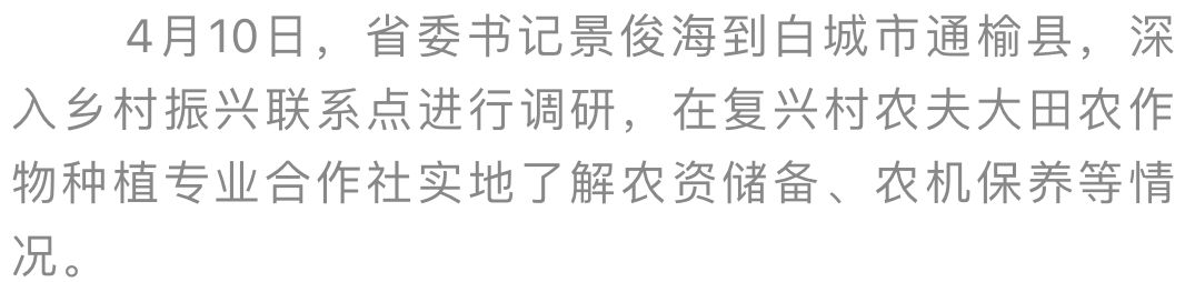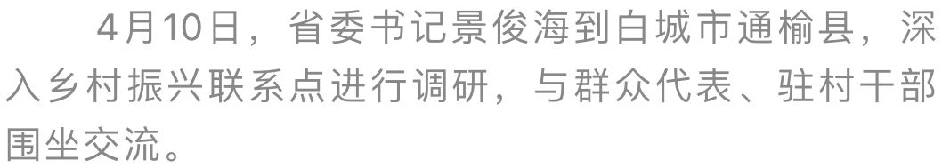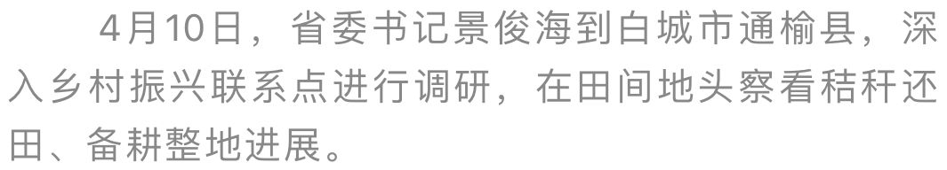 贯彻落实党中央大兴调查研究的决策部署,今天(4月10日),省委书记景俊海到白城市通榆县,深入乡村振兴联系点进行调研。他强调,要坚持以习近平新时代中国特色社会主义思想为指引,全面落实党的二十大和全国两会精神,扎实做好备春耕生产各项工作,坚决扛稳维护国家粮食安全重任;加快现代农业建设,引领乡村全面振兴,有力有效夯实吉林高质量发展根基。