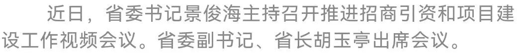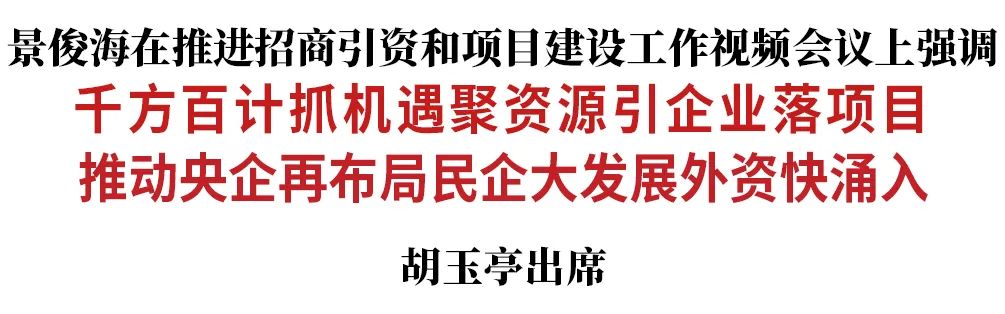 近日,省委书记景俊海主持召开推进招商引资和项目建设工作视频会议。他强调,要结合深入开展学习贯彻习近平新时代中国特色社会主义思想主题教育,认真落实习近平总书记视察吉林重要讲话重要指示精神,坚持项目为王、企业为本、环境为要、投资为先,千方百计抓机遇、聚资源、引企业、落项目,推动央企再布局、民企大发展、外资快涌入,加快形成大企业“顶天立地”、中小企业“万马奔腾”、小微企业“生龙活虎”的生动局面。省委副书记、省长胡玉亭出席会议。
