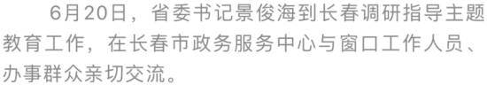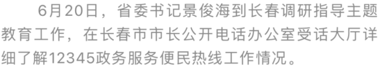 景俊海首先来到长春市政务服务中心,与窗口工作人员、办事群众亲切交流,要求长春市进一步创新政务服务模式,持续提升办事效率,更好方便群众。景俊海现场观看政策服务数字化场景应用演示,强调要深入推进政务服务数字化,把更多新业务新功能纳入“一网通办”“一码通办”,推动数字政府建设取得更大成效。在长春市市长公开电话办公室受话大厅,景俊海详细了解12345政务服务便民热线工作情况,强调要充分发挥便民热线沟通群众的桥梁纽带作用,进一步完善部门联动的问题解决机制,群众反映集中问题要及时公开处理进度和结果,切实以为民办实事、解难题的具体成果检验主题教育成效。