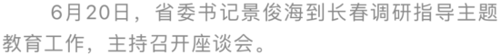 今天(6月20日),省委书记、省委主题教育领导小组组长景俊海到长春调研指导主题教育工作,并主持召开座谈会,推动党中央在全党开展主题教育和大兴调查研究的决策部署在吉林落地落实。景俊海强调,要深入贯彻习近平总书记关于主题教育的重要讲话和重要指示批示精神,坚持高标准高质量抓好主题教育,确保推进有序、措施有力、工作有效,持续推动习近平新时代中国特色社会主义思想入脑入心、见于行动。