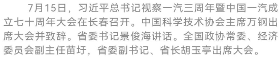 今天(7月15日),习近平总书记视察一汽三周年暨中国一汽成立七十周年大会在长春召开。中国科学技术协会主席万钢出席大会并致辞。省委书记景俊海讲话。全国政协常委、经济委员会副主任苗圩,省委副书记、省长胡玉亭出席大会。
