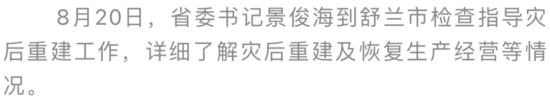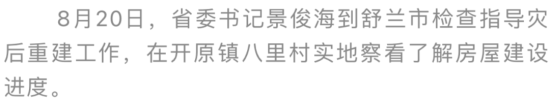 今天(8月20日),省委书记景俊海在本轮汛情发生后第三次到吉林舒兰市,实地检查指导灾后重建工作。他强调,要深入贯彻习近平总书记在8月17日中共中央政治局常务委员会会议上的重要讲话精神,凝聚起万众一心、众志成城的强大力量,坚定不移打赢灾后恢复重建这场硬仗。