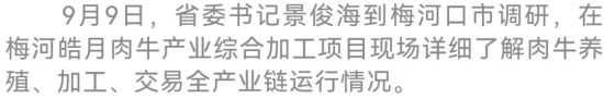 泸源酒业有限公司2万吨白酒生产建设项目是梅河口开源集团与泸州老窖集团合资项目。景俊海实地踏查施工进展,鼓励企业把传统生产工艺与吉林农特产品、道地药材结合起来,研发生产新产品,擦亮区域化、本土化品牌。梅河皓月肉牛产业综合加工项目是集肉牛养殖、加工、交易等于一体的全产业链项目,景俊海鼓励企业紧紧抓住我省推进千万头肉牛建设工程有利契机,积极发展现代生态养殖,努力建设大基地、建成大企业、发展大产业。