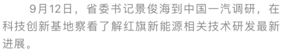 今天(9月12日),省委书记景俊海到中国一汽调研。他强调,要深入贯彻习近平总书记在新时代推动东北全面振兴座谈会上的重要讲话精神,大力实施创新驱动发展战略,坚持以科技创新推动产业创新,努力向世界一流企业迈进,为构建具有吉林特色优势的现代化产业体系提供有力支撑。