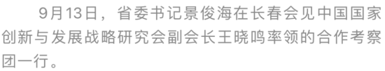 今天(9月13日),省委书记景俊海在长春会见中国国家创新与发展战略研究会副会长王晓鸣率领的合作考察团一行。