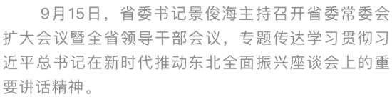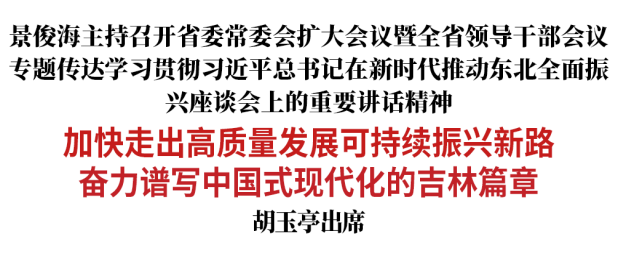 今天(9月15日),省委书记景俊海主持召开省委常委会扩大会议暨全省领导干部会议,专题传达学习贯彻习近平总书记在新时代推动东北全面振兴座谈会上的重要讲话精神。景俊海强调,要坚持重点工作再对标、再部署、再落实,切实把习近平总书记的关心关怀和殷殷嘱托转化为坚定拥护“两个确立”、坚决做到“两个维护”的高度自觉,咬定目标不放松、敢闯敢干加实干,加快走出高质量发展、可持续振兴新路,奋力谱写中国式现代化的吉林篇章。省委副书记、省长胡玉亭出席会议。