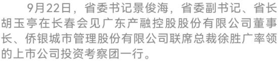 9月22日,省委书记景俊海,省委副书记、省长胡玉亭在长春会见广东产融控股股份有限公司董事长、侨银城市管理股份有限公司联席总裁徐胜广率领的上市公司投资考察团一行。