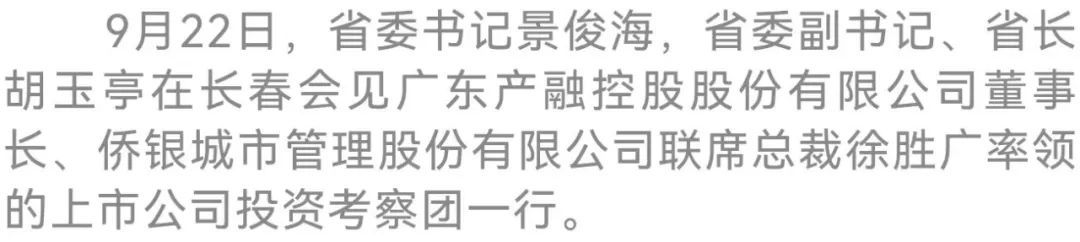 9月22日,省委书记景俊海,省委副书记、省长胡玉亭在长春会见广东产融控股股份有限公司董事长、侨银城市管理股份有限公司联席总裁徐胜广率领的上市公司投资考察团一行。