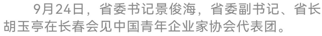 今天(9月24日),省委书记景俊海,省委副书记、省长胡玉亭在长春会见中国青年企业家协会会长,伊利实业集团股份有限公司党委书记、董事长、总裁潘刚率领的中国青年企业家协会代表团一行。