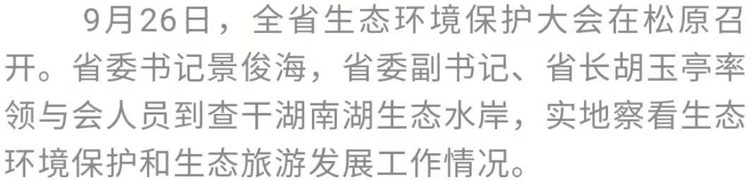 习近平总书记五年前曾亲临松原查干湖视察,对保护生态和发展生态旅游作出重要指示。景俊海、胡玉亭率领与会人员到查干湖南湖生态水岸,重温习近平总书记重要讲话重要指示精神,实地察看生态环境保护和生态旅游发展工作情况,要求始终牢记习近平总书记殷殷嘱托,采取生态化措施提升生态环境质量,围绕良好生态培育旅游新业态新模式,更好地吸引游客、聚集人气、拉动消费,坚决走好保护生态和发展生态旅游相得益彰之路,切实守护好查干湖这块“金字招牌”。