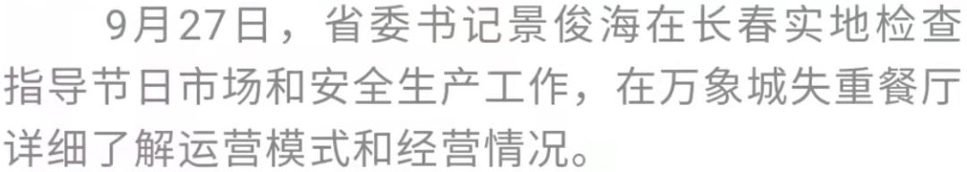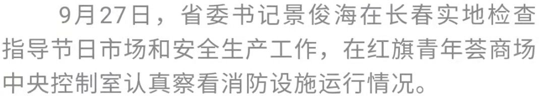 今天(9月27日),省委书记景俊海在长春实地检查指导节日市场和安全生产工作。他强调,要深入贯彻习近平总书记关于安全生产和扩大内需的重要论述,全面对标对表习近平总书记在新时代推动东北全面振兴座谈会上的重要讲话精神,坚守为民情怀,时刻心系百姓,扎实做好安全生产工作,进一步丰富市场供应、稳定商品价格、满足消费需求,确保群众度过平安欢乐祥和节日。
