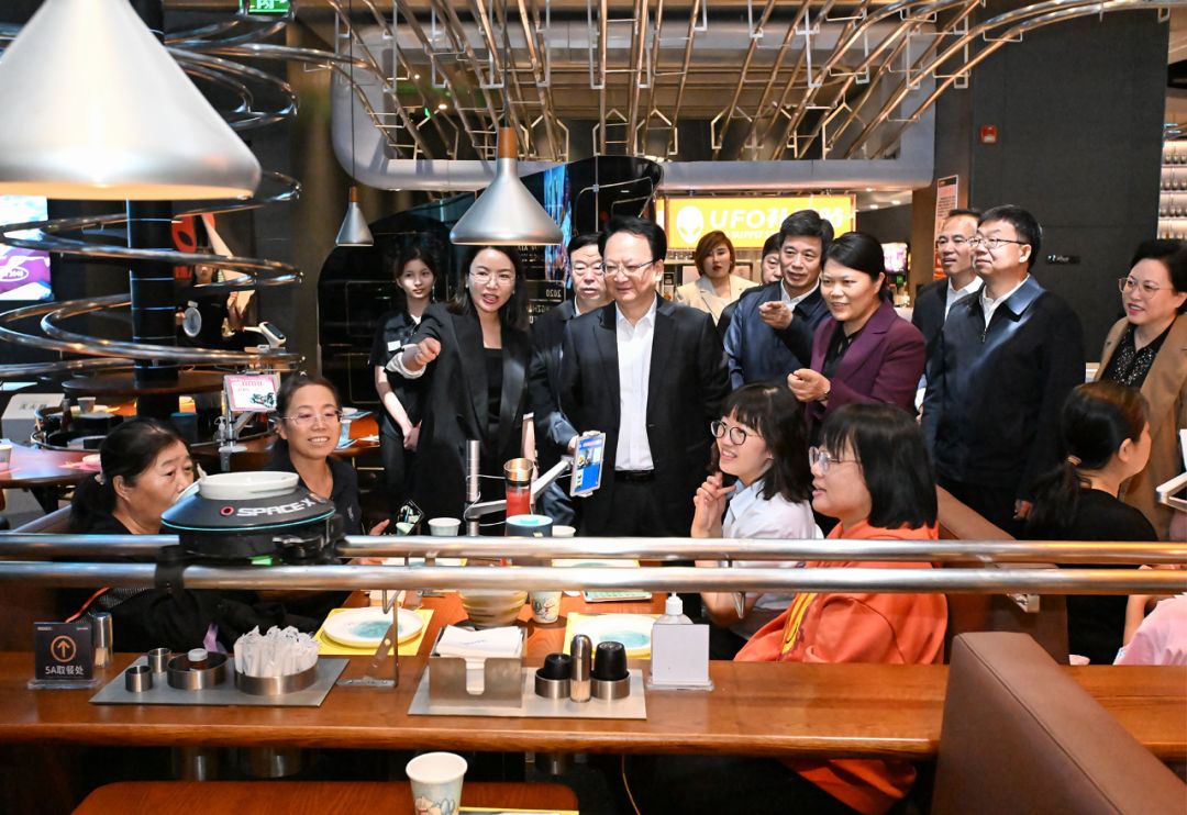 长春万象城客流如织、人气火爆,是城市新晋网红打卡地。景俊海来到0LE超市,详细了解蔬菜、水果、副食等商品供应情况,要求有关部门组织商场与当地货源对接,统筹线上线下渠道,更好帮助吉林特色农产品拓展销路、抢占市场。失重餐厅是一家无人点餐、无人送餐、无人收银餐厅。景俊海详细了解独特运营模式,强调要以创新赋能传统业态,不断为群众提供新服务、创造新体验,更好地满足群众多样化需求。