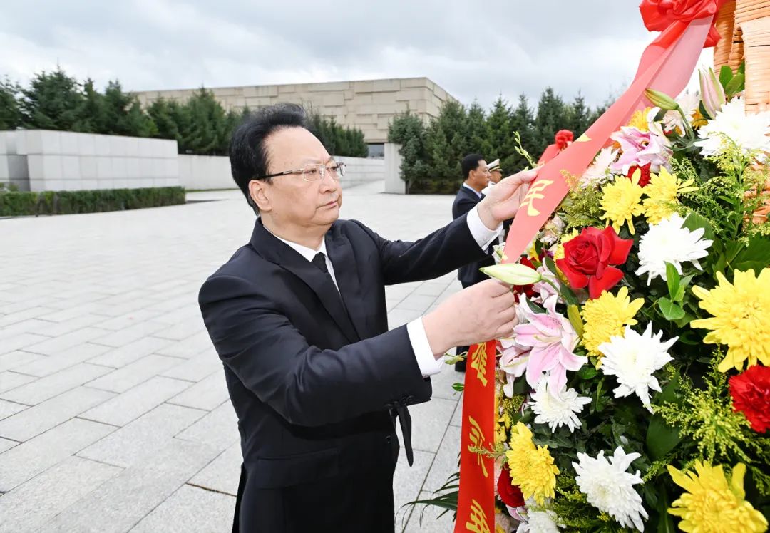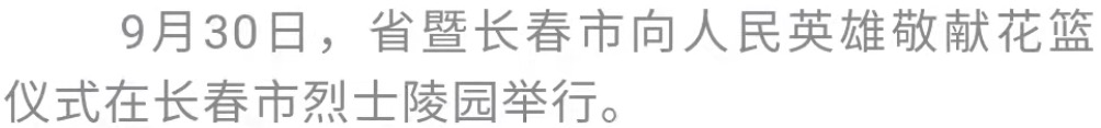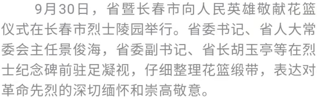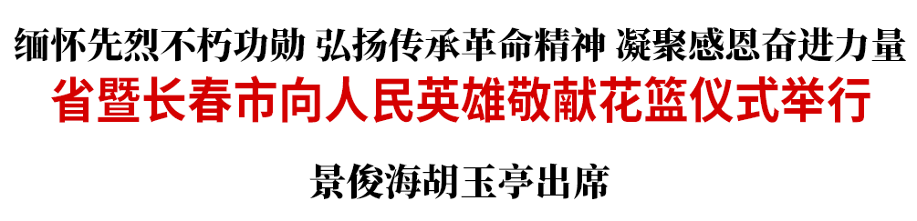在第十个烈士纪念日到来之际,省暨长春市向人民英雄敬献花篮仪式今天(9月30日)在长春市烈士陵园举行。省委书记、省人大常委会主任景俊海,省委副书记、省长胡玉亭等我省党政军领导和老战士、老同志、烈士家属、长春市各界干部群众代表一起,向人民英雄敬献花篮,缅怀先烈不朽功勋,弘扬传承革命精神,凝聚感恩奋进力量,表达全省上下坚持以习近平新时代中国特色社会主义思想为指引,深入贯彻落实习近平总书记在新时代推动东北全面振兴座谈会上的重要讲话精神,努力在新征程上重振雄风、再创佳绩的坚定决心和必胜信心。