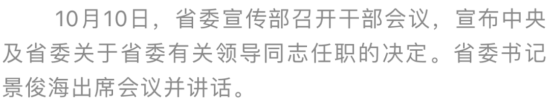 今天(10月10日),省委宣传部召开干部会议,宣布中央及省委关于省委有关领导同志任职的决定。省委书记景俊海出席会议并讲话。他强调,要深学细悟习近平文化思想,紧密结合学习宣传贯彻习近平总书记在新时代推动东北全面振兴座谈会上的重要讲话精神,认真落实全国宣传思想文化工作会议部署要求,坚定文化自信,秉持开放包容,坚持守正创新,奋力开创全省宣传思想文化工作新局面。
