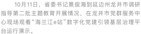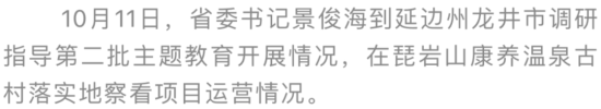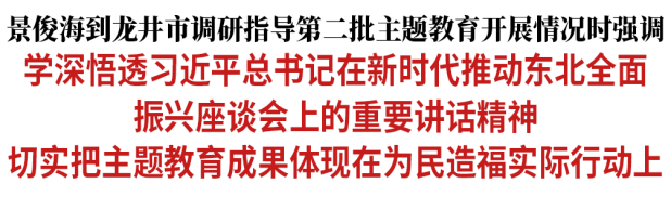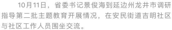 今天(10月11日),省委书记景俊海到延边州龙井市调研指导第二批主题教育开展情况。他强调,要坚持以习近平新时代中国特色社会主义思想为指引,学深悟透习近平总书记在新时代推动东北全面振兴座谈会上的重要讲话精神,深入开展第二批主题教育,全面加强基层党的建设,推动“我为群众办实事”常态化长效化,切实把主题教育成果体现在为民造福实际行动上,持续提升基层党组织领导基层治理能力水平,更好赢得群众对党的信任和拥护。