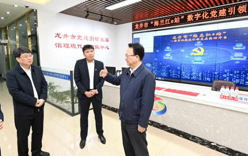在安民街道吉明社区,景俊海深入了解第二批主题教育开展情况,要求基层党组织坚持以学铸魂、以学增智、以学正风、以学促干,把高标准、严要求贯通理论学习、调查研究、推动发展、检视整改全过程,推动习近平新时代中国特色社会主义思想入脑入心、入魂入行。景俊海与社区工作人员围坐交流,勉励大家树牢宗旨意识,坚守为民情怀,用心用情用力为群众办实事、解难题,让人民群众切身感受到主题教育带来的实实在在变化。希望社区党总支以开展第二批主题教育为契机,组织社区党员深入群众做好为民服务、化解矛盾、破解难题等工作,进一步增强基层党组织的组织力、凝聚力、战斗力,成为有效实现党的领导的坚强战斗堡垒。景俊海来到龙井市党群服务中心,现场观看“海兰江e站”数字化党建引领基层治理平台运行演示,强调要继续用好这一平台,让数据多跑路、群众少跑腿,进一步探索实现更多便民惠民服务功能,更好地以数字技术赋能基层治理体系和治理能力现代化。
