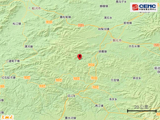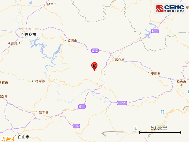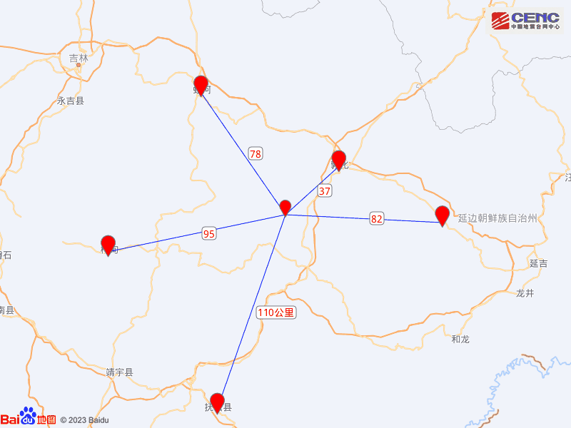 周边县城:震中距敦化市37公里、距蛟河市78公里、距安图县82公里、距桦甸市95公里、距抚松县110公里,距延边朝鲜族自治州131公里,距长春市223公里。