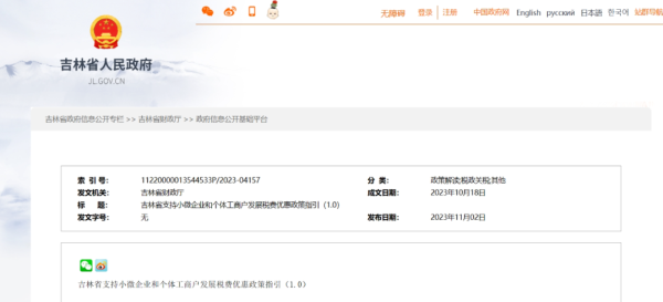 11月2日,吉林省人民政府发布《吉林省支持小微企业和个体工商户发展税费优惠政策指引(1.0)》,帮助纳税人更好地了解政策、掌握政策、用好政策,最大程度地释放政策红利、激发市场活力、稳定市场信心。