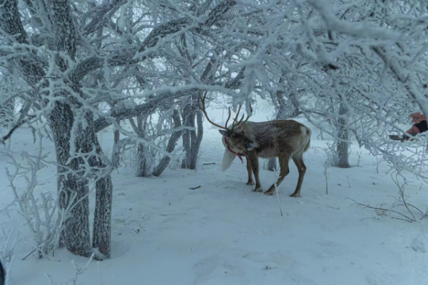 让人感到惊喜的是,景区内有一群养殖的驯鹿,买一筐苔藓就能进入到园里跟它们来个亲密接触,以雾凇为背景,和驯鹿合影,超级出片。