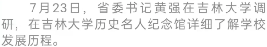 黄强首先来到吉林大学历史名人纪念馆,详细了解林枫、饶斌、江一真、李四光、陈先舟、任抟九等吉大先贤创校兴校的奋斗历程。黄强说,吉林大学是新中国成立后我们党亲手创建的第一所综合性大学,每一页校史中都镌刻着红色基因。希望广大师生传承发扬良好校风,努力把学校建设好、发展好,在新征程上争先进位、再创辉煌。在黄大年纪念馆,黄强强调,要大力弘扬黄大年精神,激励更多师生投身科技报国事业。黄强观看习近平法治思想研究中心成果展示,希望认真梳理法治与改革的关系,更好从法治角度阐释进一步全面深化改革的科学理论。在古籍研究所,黄强叮嘱要保护好、运用好珍贵的古籍典藏,努力推动中华优秀传统文化创造性转化、创新性发展。黄强来到综合极端条件高压科学中心,充分肯定“地壳一号”万米钻机系统研发成果,鼓励他们进一步加强与国家实验室等科研单位交流合作,努力攻克更多“卡脖子”难题。在观看汽车自动轮智行底盘操作演示时,黄强勉励吉大在教育、科技、人才、产业一体发展上走在前列,为教育强国、科技强国、制造强国建设贡献吉林力量。