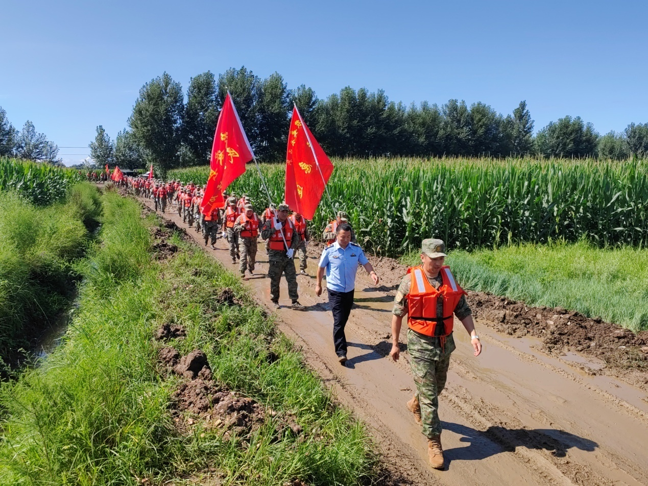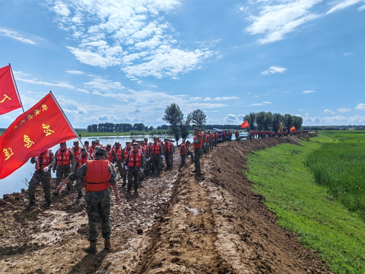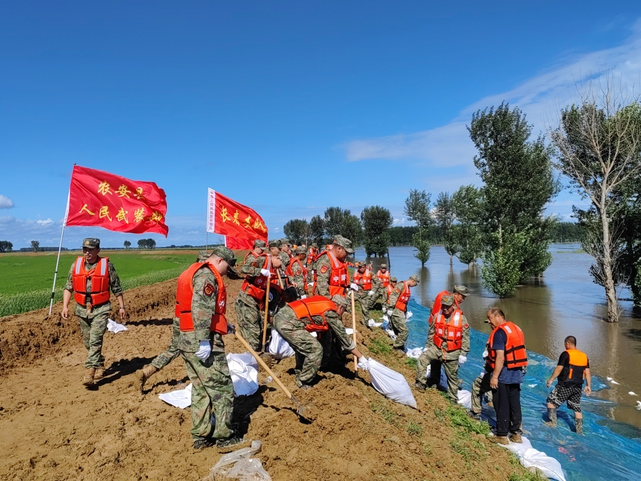 近日来,受连续强降雨和上游泄洪影响,农安县辖区靠山段饮马河下游河段水位超警戒线运行。7月29日,农安县防汛抗旱指挥部依据专家建议,决定在堤坝上铺设塑料布,消除大堤渗水、滑塌、决堤隐患,在因大坝泥泞湿陷无法使用大型机械的情况下,县防总决定让民兵应急分队执行此次护堤加固任务。人武部闻“汛”而动,迅速集结民兵应急分队,组成抗洪抢险“民兵突击队”,依令直抵险情第一线。