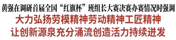 首届全国“红旗杯”班组长大赛由全国总工会、吉林省政府主办。大赛共设置铁路、建筑、电力、化工、机械、钢铁、有色金属、建材、国防科技工业、轻工10个行业赛道,吸引了全国近65万名班组长报名参赛。经过初赛和复赛,400名班组长脱颖而出、进入决赛。黄强实地察看办赛工作情况,对全国总工会在吉林举办首届全国班组长大赛决赛表示感谢。他强调,创新是引领发展的第一动力。构建支持全面创新体制机制,提升创新体系整体效能,离不开一线职工的探索实践。要全力办好这一赛事,支持参赛选手取得优异成绩。要通过改革建立完善机制,更好激发一线职工创新创造热情,激励他们在“卡脖子”技术难题攻关、生产工艺改进等方面发挥更大作用。