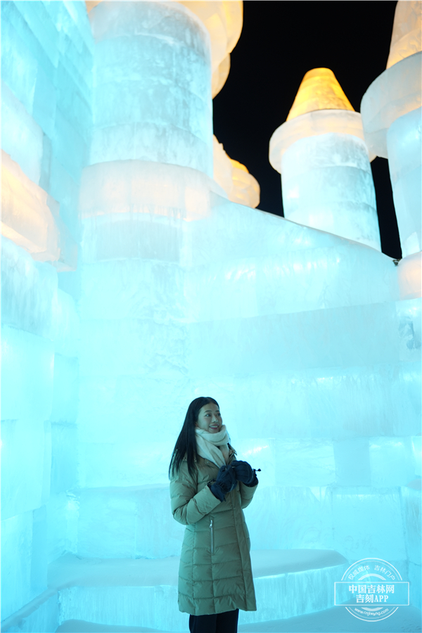 晶莹剔透的蓝冰是净月潭冬季的一大奇景。与常见的白色冰块不同,净月潭景区的蓝冰在阳光照射下天然呈现为淡蓝色,极具观赏性。香港演员何佩瑜在蓝冰前拍照并惊叹:“这些蓝冰真的像天然的艺术品,让人忍不住想一直拍照。”