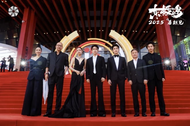 电影《东极岛》导演管虎、费振翔,出品人、总制片人梁静,摄影指导高伟喆,领衔主演朱一龙、吴磊、倪妮一同亮相开幕红毯。