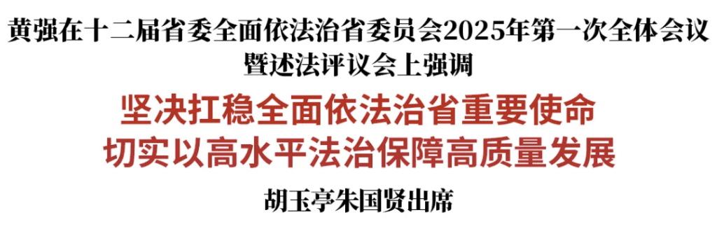 4月25日,省委书记、省委全面依法治省委员会主任黄强主持召开十二届省委全面依法治省委员会2025年第一次全体会议暨述法评议会。他强调,要深入学习贯彻习近平法治思想,认真落实党中央决策部署,坚决扛稳全面依法治省重要使命,切实以高水平法治保障高质量发展。省长、省委全面依法治省委员会副主任胡玉亭,省政协主席、省委全面依法治省委员会副主任朱国贤出席会议。