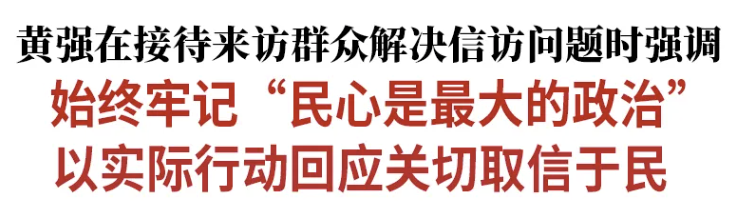 5月15日,省委书记黄强在长春接待来访群众,现场研究办好群众急难愁盼的事,以点带面系统解决同类问题。黄强强调,要始终牢记“民心是最大的政治”,坚持把人民放在心中最高位置,以接受中央巡视和开展深入贯彻中央八项规定精神学习教育为契机,加大问题解决力度,切实维护好群众切身利益,满足合理合法诉求,以实际行动回应关切、取信于民。