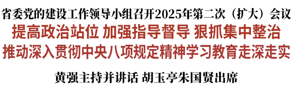 5月16日,省委党的建设工作领导小组召开2025年第二次(扩大)会议,传达学习中央党的建设工作领导小组第12次会议和有关文件精神,认真落实中央层面学习教育工作部署要求,研究推进全省学习教育集中整治工作,推动深入贯彻中央八项规定精神学习教育走深走实。省委书记、省委党的建设工作领导小组组长黄强主持会议并讲话。省委副书记、省长胡玉亭,省政协主席朱国贤出席会议。