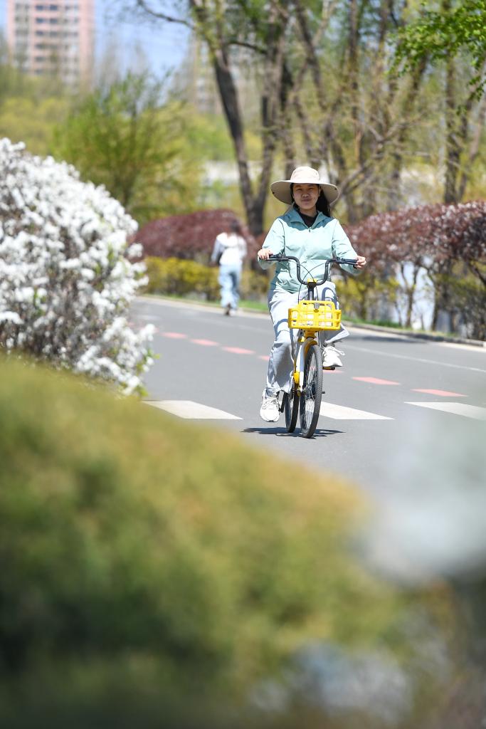 市民在长春伊通河滨水绿道上骑车。新华社记者张楠 摄