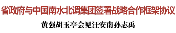 6月4日,省委书记黄强,省委副书记、省长胡玉亭在长春会见中国南水北调集团有限公司党组书记、董事长汪安南和总经理孙志禹一行,并共同见证省政府与中国南水北调集团签署战略合作框架协议。