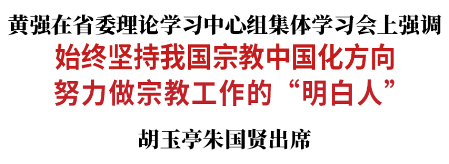 6月13日,省委书记黄强主持召开省委理论学习中心组集体学习会。他强调,宗教问题是党治国理政必须处理好的重大问题,要深入学习贯彻习近平总书记关于宗教工作的重要论述,从政治上认识和把握宗教工作,全面贯彻党的宗教工作基本方针,始终坚持我国宗教中国化方向,以特别严肃、特别慎重、特别务实的态度管好宗教事务,努力做宗教工作的“明白人”。省委副书记、省长胡玉亭,省政协主席朱国贤出席会议。